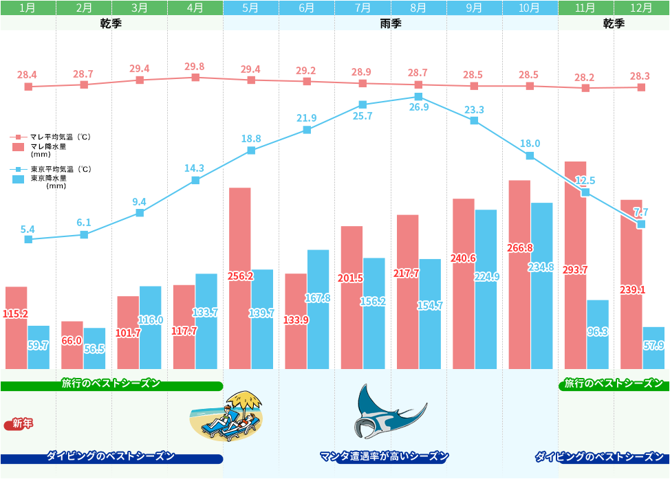 モルディブは高温多湿の熱帯性気候。4月が最も暑く、12月が最も涼しくなりますが、1年を通して気候の変化は少なく平均気温は29〜32度。日中はTシャツで快適に過ごせるでしょう。