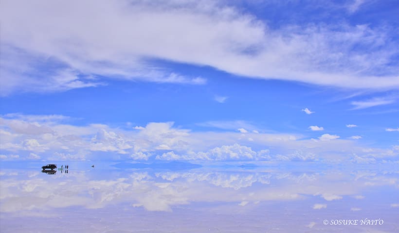 ウユニ塩湖は四国の約半分の面積を持ち、アメリカ大陸最大の塩湖です。雨季になると湖面にうっすらと水が張り、完全に平らな水面は眼に入るもの全てを映し出す巨大な「鏡」となります。天国のように幻想的な風景はまさに「天空の鏡」と呼ばれています。