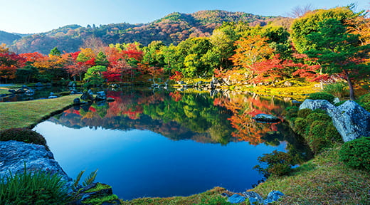 世界文化遺産にも認定登録されている「曹源池庭園」は、680年前のそのままの姿をとどめている由緒ある臨済宗天龍寺派の大本山。特に早朝、紅葉の鮮やかな庭園に朝日が当たる様子はまさに絶景です。庭園裏、真っ赤な紅葉が一面を覆う「紅葉のトンネル」もお忘れなく。庭園内で節月謹製の精進料理がいただけます(要予約)。