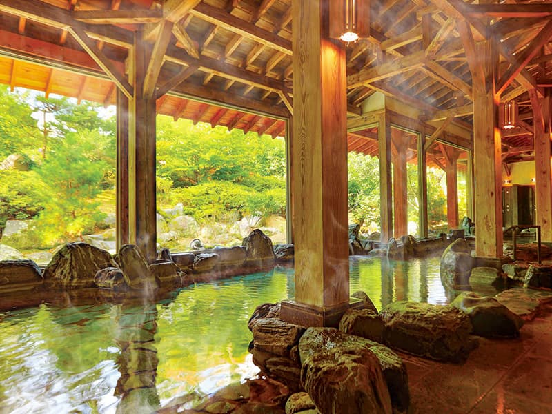 日本三大美肌の湯とされる温泉。無色透明のぬめりのあるお湯を浴びると、驚くほど潤いつるつるになると言われています。自然にも恵まれており、周辺には嬉野茶を栽培する茶畑が広がります。